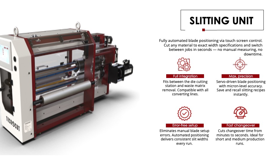 The slitting unit is designed for full integration into existing production lines, delivering seamless operation and maximum efficiency. With automatic blade adjustment, it ensures precise and consistent cutting performance across a wide range of materials. By minimizing operator intervention, the system reduces setup errors and improves overall reliability. Engineered for high performance, it maintains accuracy even at elevated speeds, helping to increase productivity while reducing waste.