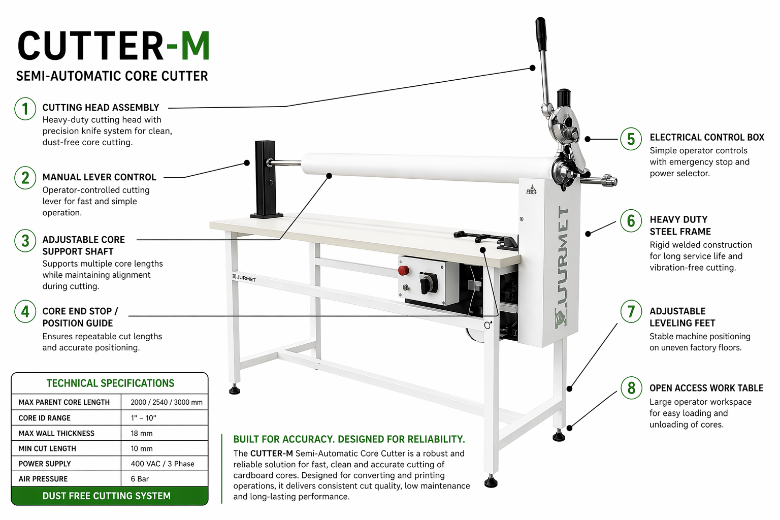 High-performance core cutting. The Cutter-M is a manual core cutter designed to cut cardboard cores. Cores are cut manually by a specially designed circular knife for a dust-free cut. There are currently more than 700 machines in operation all around the world. This machine is most popular due to its low price and high quality.