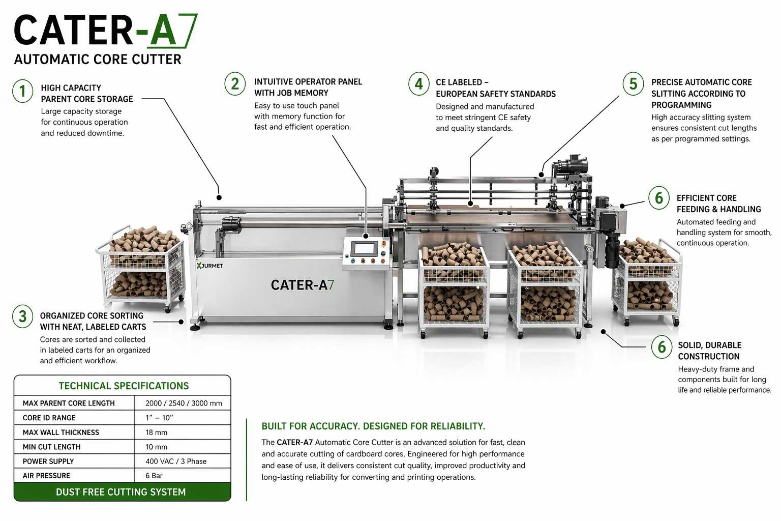 The CATER-A automatic core cutter, with an optional loading device, automates the slitting process. Operators load cores and program slits and widths on the control panel.