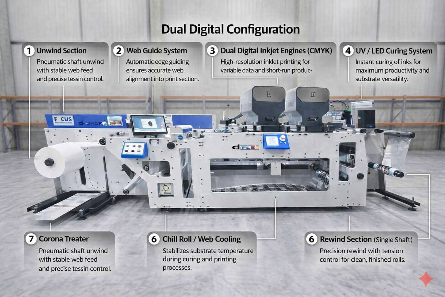 - Both engines include PC, front-end software + RIP, and options for roll-to-roll, corona treatment, web cleaners, anti-static systems, and video inspection.