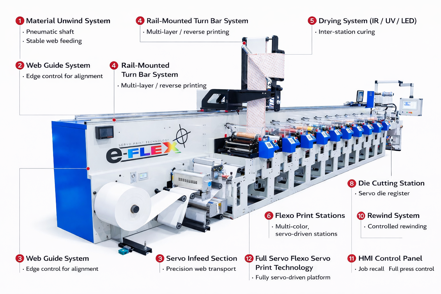 - Servo Print Technology: Each print station has two separate servo drives for web impression and print cylinder control, ensuring precise tension management and accurate print-to-die cut alignment.