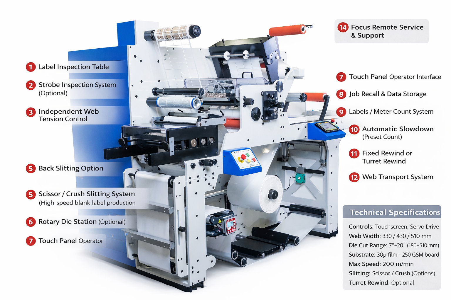 The SRC-T offers numerous customer benefits for label inspection and finishing. It features a semi-automatic turret for producing small rolls of finished labels and an optional heavy-duty rotary die and waste rewind system with a side-loading feature for converting blank labels. The layout is designed to optimize production output with minimal downtime, ensuring precise repeatability and high-quality product finishing across a wide range of substrates and applications.